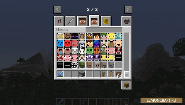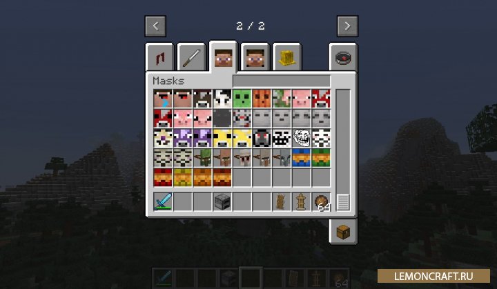 Мод на шляпы и маски Masks-Hats добавляет в игру новые головные уборы и маски изображающие различных героев и мобов. Меняйте свою личину и предстаньте перед своими друзьями в новом обличье.